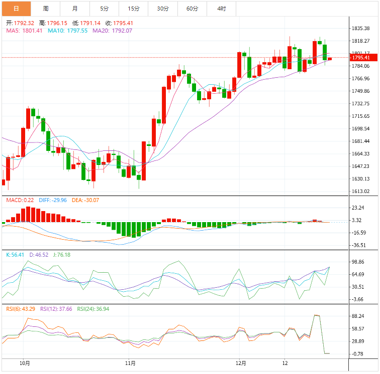美原油:截止发稿,美原油大幅震荡,现报78.19,跌幅0.04%。欧市盘中,油价周四在震荡交投中下跌,美国冬季风暴导致该国原油库存紧张的影响,被对美联储加息和新冠病例激增将抑制需求的担忧盖过。日内关注,美国11月营建许可月率修正值和PCE物价指数年率,美国11月耐用品订单月率初值和个人支出月率,加拿大10月季调后GDP月率,美国12月密歇根大学消费者信心指数终值和美国11月季调后新屋销售年化总数。