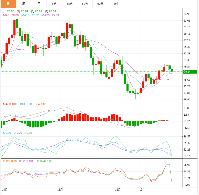 美原油:截止发稿,美原油大幅震荡,现报78.14,跌幅0.90%。欧市盘中,油价在垂直下降到77.50美元附近后出现了反应性的买盘行动。在中国政府重新开放措施的步伐加快的带动下,油价有望获得需求,而能源信息署(EIA)公佈的官方石油库存数据可能会加速黑金的波动。
