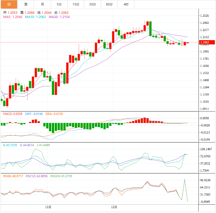 英镑:英镑/美元表现平平,因为投资者在节日市场气氛中限制了自己的大额头寸。英镑整理于1.2060下方的10个点区间,并可能延续盘整。英镑正在积聚动能,寻求突破小时图下降三角形形态。英镑/美元整理于12月19日高点1.2242以来的下降倾向趋势附近,而上述形态水平支撑位处在12月22日低点1.1992。