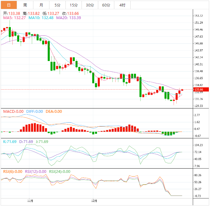 欧元兑美元周四尾盘下跌0.79%,收报1.0519美元,此前欧元最低跌至1.0514美元,为12月12日以来最低。美元兑日元周四上涨了0.59%,至133.40日元,盘中最高曾触及21日均线134.05,为近一周新高。