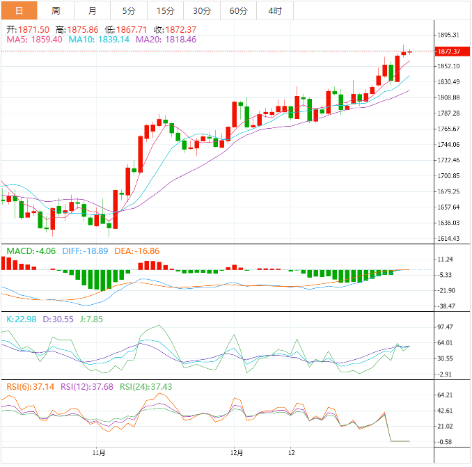技术面:黄金价格在每盎司1880美元上方出现抛售压力,呈现出疲态。金价已经形成了双顶图表模式,这表明熊市逆转。金价已经跌破20周期指数移动平均线(EMA),位于1871.80美元,这表明金价将在向北的趋势中进行修正。
