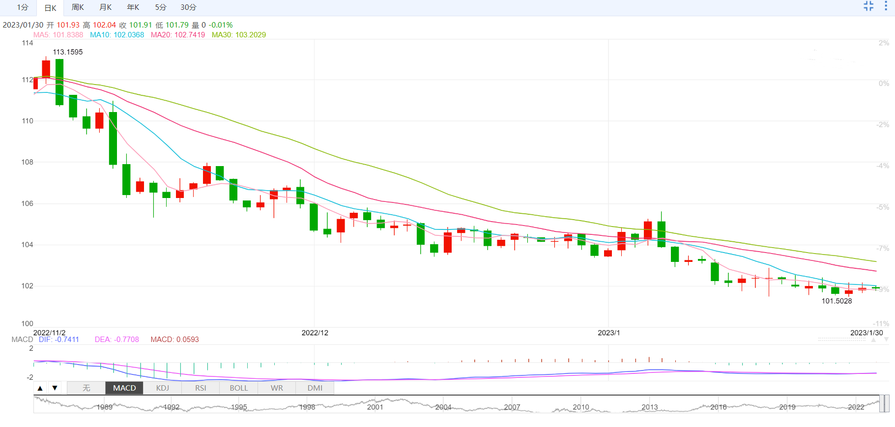 美原油:截止发稿,美原油小幅下跌,现报78.96,跌幅1.32%。欧市盘中,石油输出国组织(OPEC)联合部长级监督委员会(JMMC)和以俄罗斯为首的盟国,统称为OPEC+,不太可能在2月1日的会议上建议改变石油产量政策。最近美联储接近政策转向的可能性越来越大,也增加了WTI原油的力量。上周,好于预期的第四季度国内生产总值(GDP)和12月核心个人消费支出(PCE)价格指数受到了广泛关注。然而,实际发布的数据比之前的结果要疲软,因此表明美联储(Federal Reserve)的提前加息最终帮助对支出和通胀担忧施加了下行压力。