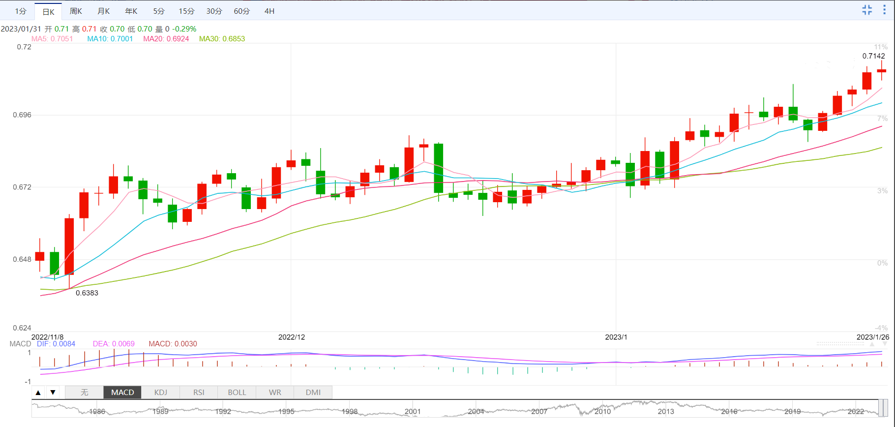 澳元/美元出现巨大抛压,由于澳大利亚统计局发布的零售销售数据(12月)疲弱,澳元/美元已经跌至0.7030附近。澳大利亚零售销售月率出现负增长录得-3.9%,低于预期-0.3%和前值1.4%。展望后市,澳元将跟随财新制造业採购经理人指数数据出现波动,该数据将于週三发布。根据预测,中国财新制造业採购经理人指数将自前值49.0升至49.5。中国经济正在全面开足马力运行,不排除经济需求复甦的可能性。值得注意的是,澳大利亚是中国的主要贸易伙伴,中国经济活动回暖将支持澳元。