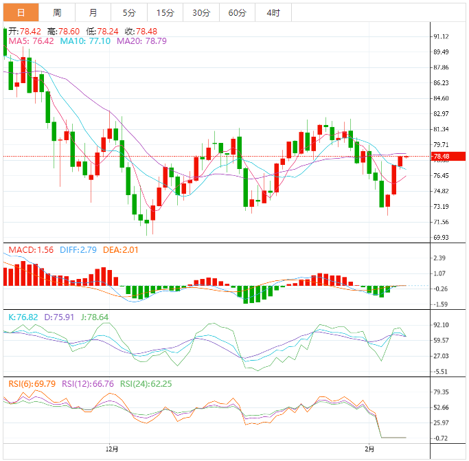 美原油:截止发稿,美原油小幅上涨,现报78.49,涨幅0.03%。欧市盘前,油价突破78.50美元的阻力位,正艰难地继续上行。由于投资者忽视了美联储(Fed)主席杰罗姆·鲍威尔(Jerome Powell)及其同事在利率问题上的强硬立场,预计油价将继续上涨。