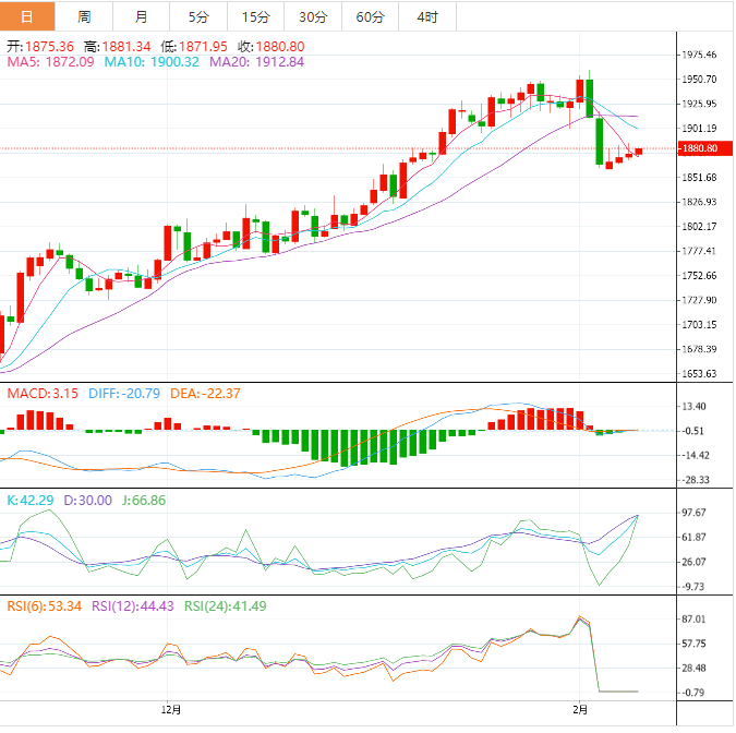 现货黄金:截止发稿,现货黄金小幅上涨,现报1880.48,涨幅0.28%。欧市盘前,金价突破1880美元刷新当日高点后回落。由于市场参与者的风险偏好情绪改善,金价自1872美元反弹后直线拉升。预计金价将进一步上涨突破1880美元,因为美债收益率走软令风险厌恶情绪缓和。