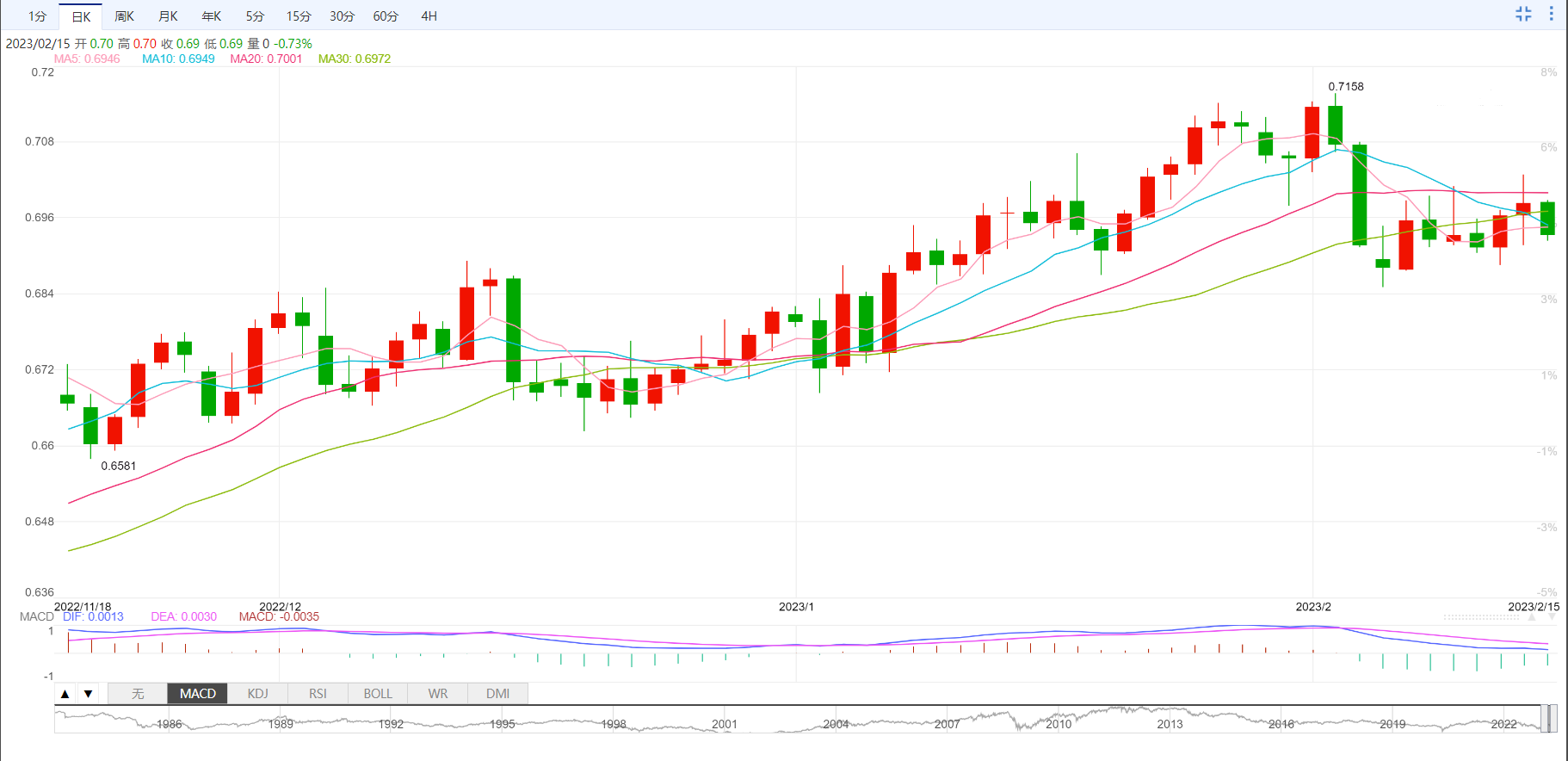 澳元兑美元一度下跌0.76%至0.6932,隔夜曾一度高见0.7030美元。目前支撑位在0.6905。