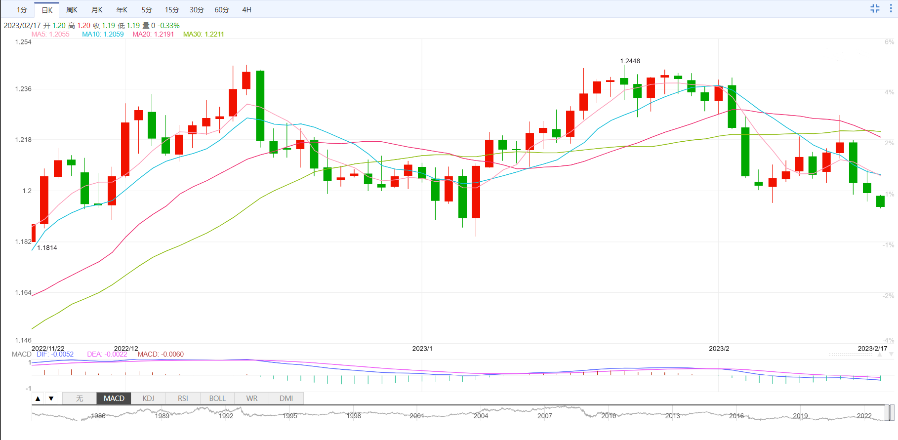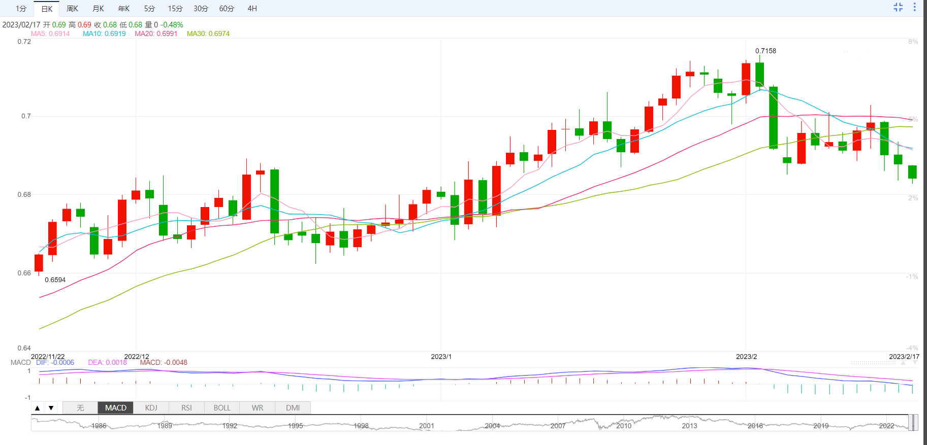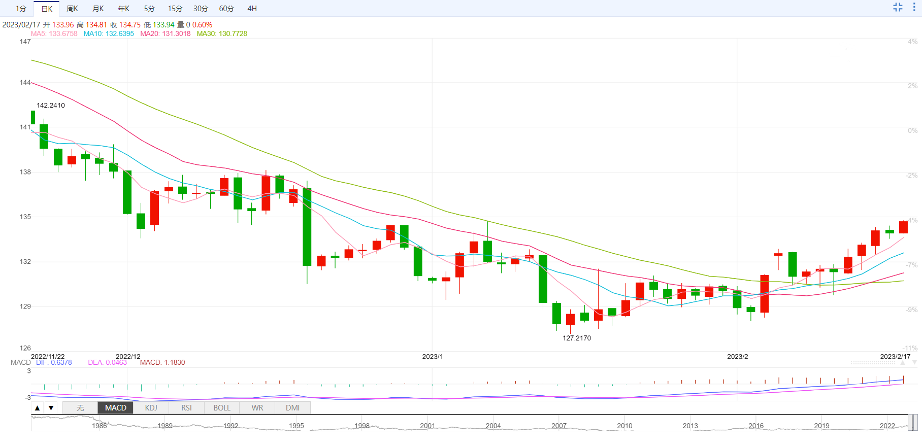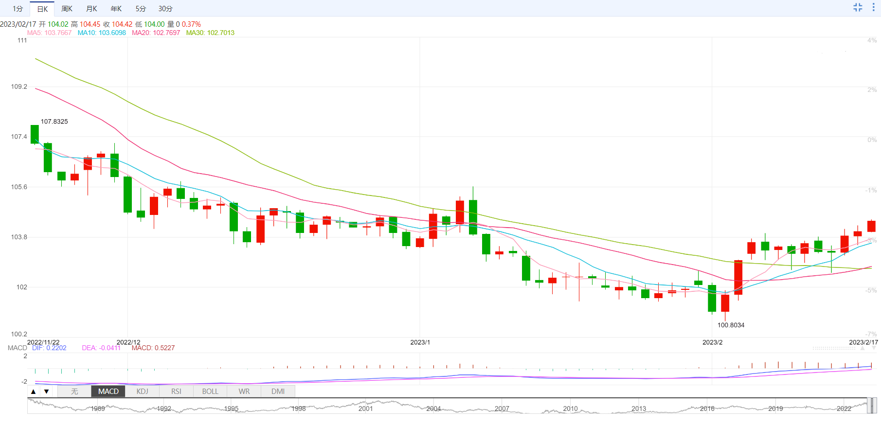 美元指数盘整于一个半月高位104.30附近。在这期间,由于美国数据强劲且美联储政策制定者发表积极讲话,市场担忧美联储今后将维持鹰派,美元对六种主要货币获得提振。美国一系列有关通胀、就业和产出的经济数据,为推动美联储政策政策转向提供了支撑。这种趋势可以从美联储官员的最新讲话和美联储观察工具中得以体现。即将发布的积极的美国宏观经济数据加大上述预期。这些数据表明,尽管借贷成本不断上升,通胀居高不下,但美国经济仍具有韧性。此外,美联储多位成员发表鹰派论调表明,美联储将继续收紧货币政策。这反过来又推动美国国债收益率全面走高,并支撑美元。