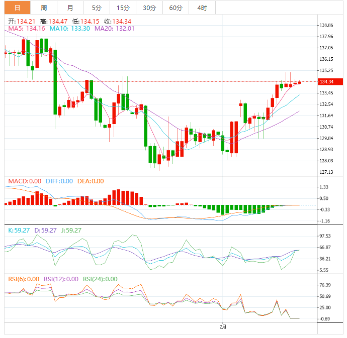 周二盘中,美元指数窄幅震荡,目前交投于103.97附近。周一因恰逢美国总统日,美国股市休市,外汇市场整体波动较小,虽然上周五美元指数冲高回落,但周一顶住了进一步回调压力,守在近六周高位附近,接近收平,收报103.88,因为受到过去几周强劲美国经济数据的支持,交易员押注美联储维持货币政策紧缩的时间将比最初预期更长。