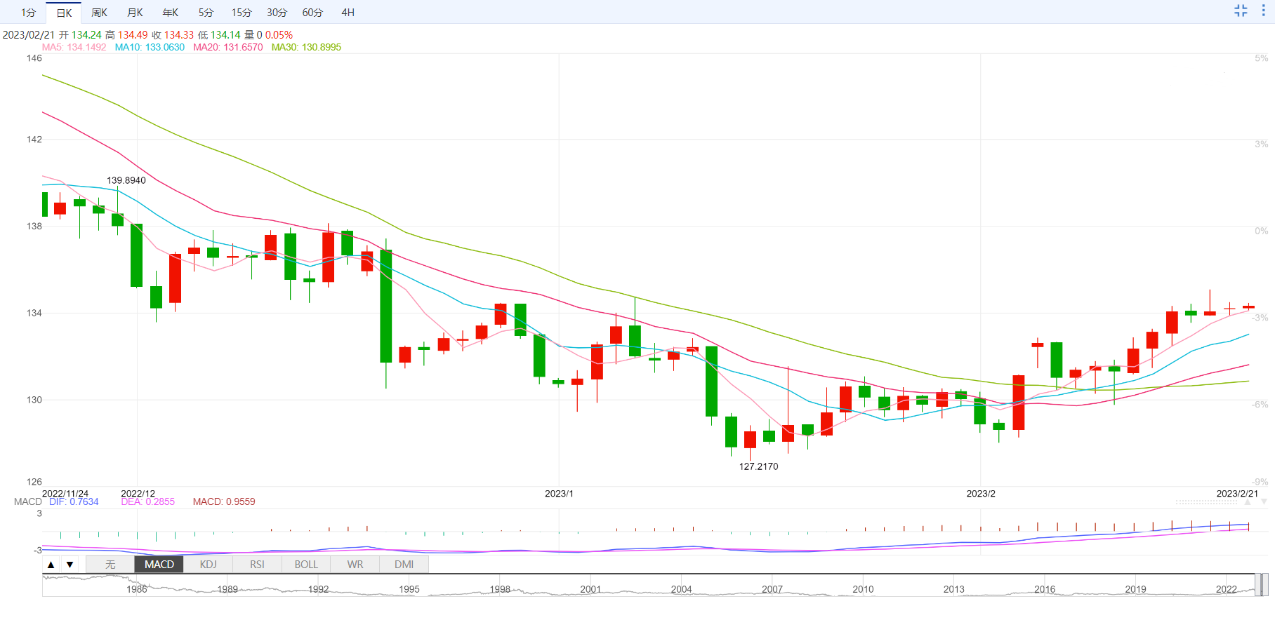 美元/日元处在三日上涨趋势当中,盘整于盘中高位134.35-40附近。在这期间,美元/日元跟随美债收益率上升,同时试图验证日本央行行长黑田东彦鹰派论调和2月採购经理人指数好坏参半。日本日经银行制造业採购经理人指数初值降至2020年9月以来的最低水平,为47.4,低于预期和前值48.9。然而,服务业採购经理人指数意外录得53.6,高于市场预期的51.5和之前的51.1。