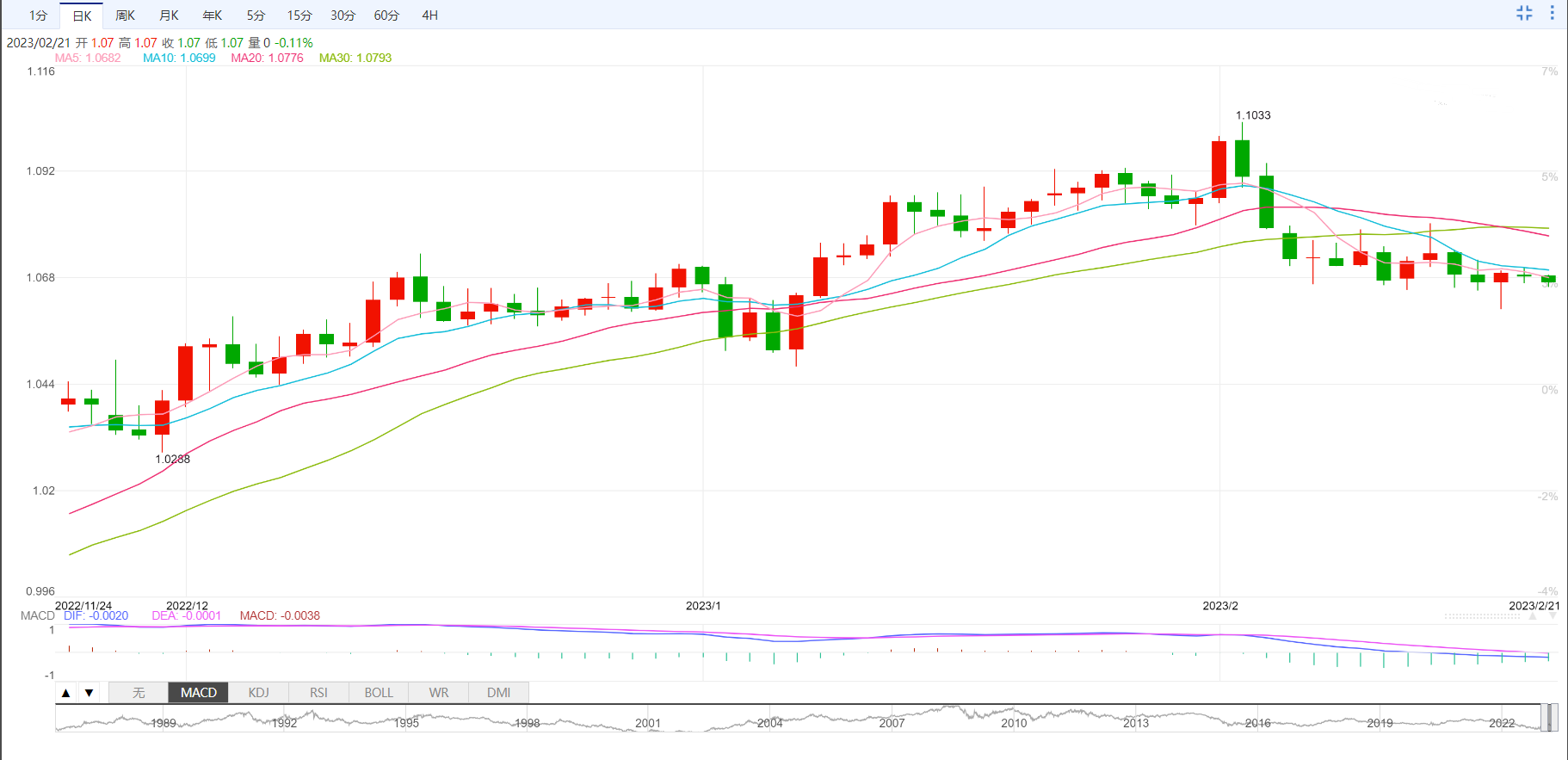 欧元兑美元周一收盘跌0.08%,报1.0685,受到美国假期影响,整体波动较小,在触及1.0687后,欧元周二在平静的亚洲时段走低,一度刷新两日低点至1.0662。