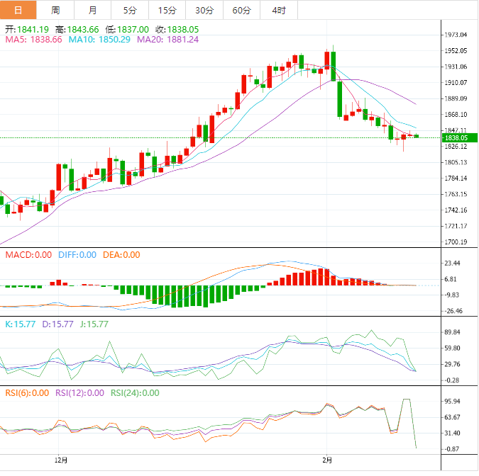 技术面:相对强弱指标(14)自20.00-40.00看跌区间进入40.00-60.00区间,表明目前金价暂时不再看跌。金价目标是突破20期指数移动均线(EMA)1,841.00美元上方,这将引发金价短线看涨趋势。