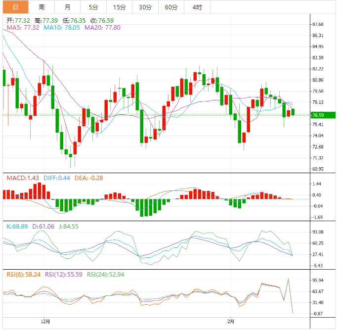 美原油:截止发稿,美原油小幅下跌,现报76.59,跌幅0.73%。欧市盘前,WTI油价小幅下跌至77.30美元附近,周初涨幅有所回落。在这期间,WTI油价交投于两日上升趋势通道内。