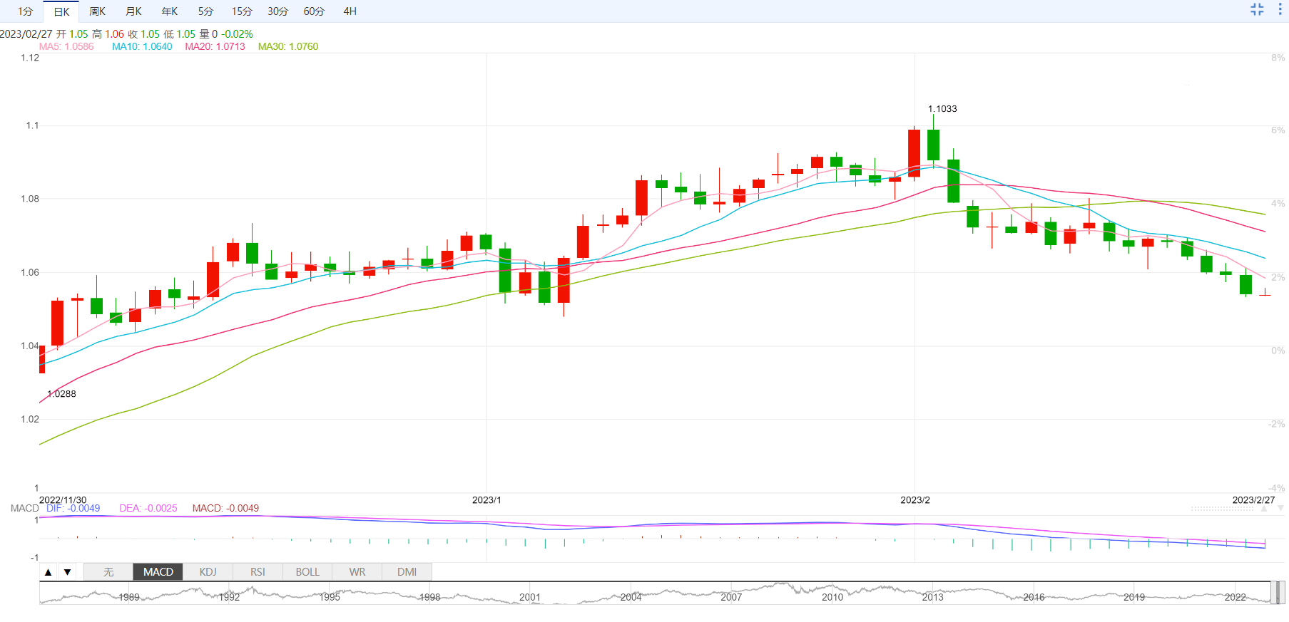 美元指数:截止发稿,美元指数上涨,现报105.35,涨幅0.08%。欧市盘前,美元指数盘整了自1月初以来的最高水平,在105.15附近小幅下跌。尽管如此,美元兑六种主要货币的指数在上周创下了自2022年9月以来的最大单周涨幅,并出现了为期四周的上涨趋势,之后从1月初的2023年峰值回落。