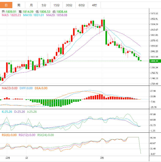 现货黄金:截止发稿,现货黄金小幅看跌,现报1808.44,跌幅0.14%。欧市盘前,黄金价格刷新了两个月来的低点,至1808美元左右。如此一来,在围绕美联储(Fed)的鹰派担忧和地缘政治担忧的情况下,金价证明了美元在一周开始回落后的最新回升是合理的。