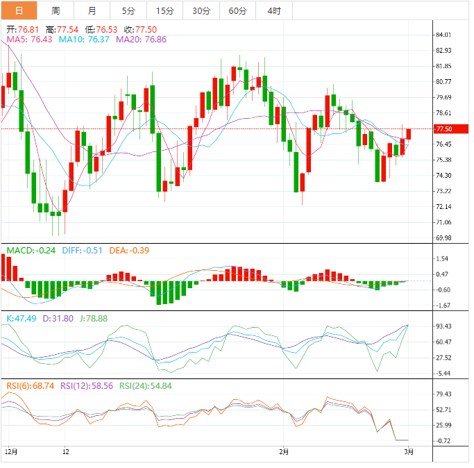 美原油:截止发稿,美原油小幅上涨,现报77.50,涨幅0.88%。欧市盘前,原油在突破每桶77.50美元后,出现了大幅调整。油价已下跌76.60美元,由于投资者正在等待财新(Caixin)制造业PMI数据的发布,预计油价将继续处于紧张状态,以寻求新的动力。