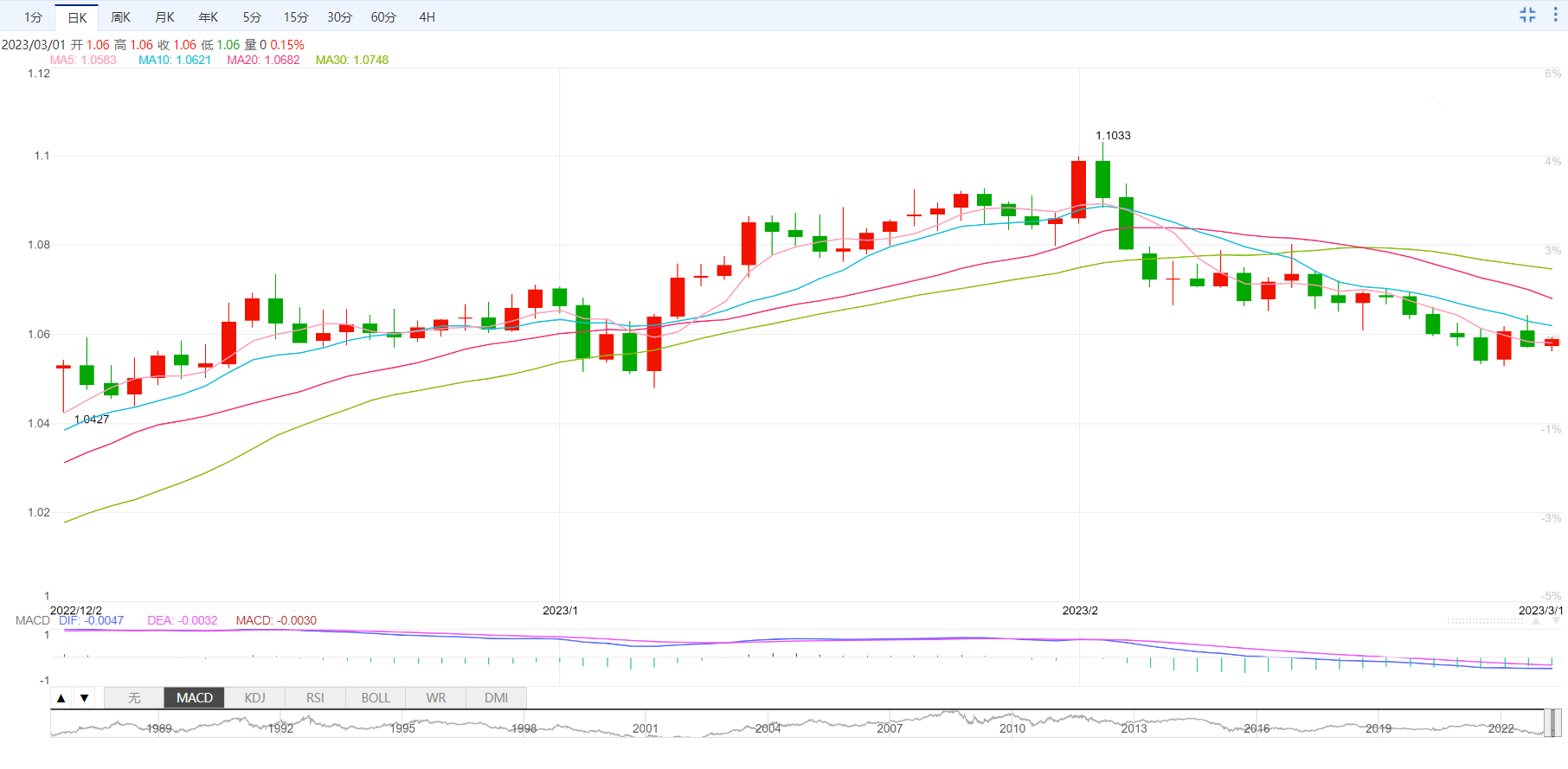 美元指数:截止发稿,美元指数下跌,现报104.82,跌幅0.16%。欧市盘前,围绕美联储利率变动的鹰派担忧随后召回了美元买家。值得注意的是,美元指数创下了自2022年9月以来的最大单月涨幅,不要忘记它在2月份结束了长达4个月的下跌趋势。交易员们准备迎接至关重要的3月份的关键数据/事件,包括美联储主席杰罗姆·鲍威尔的讲话和美联储的货币政策会议。