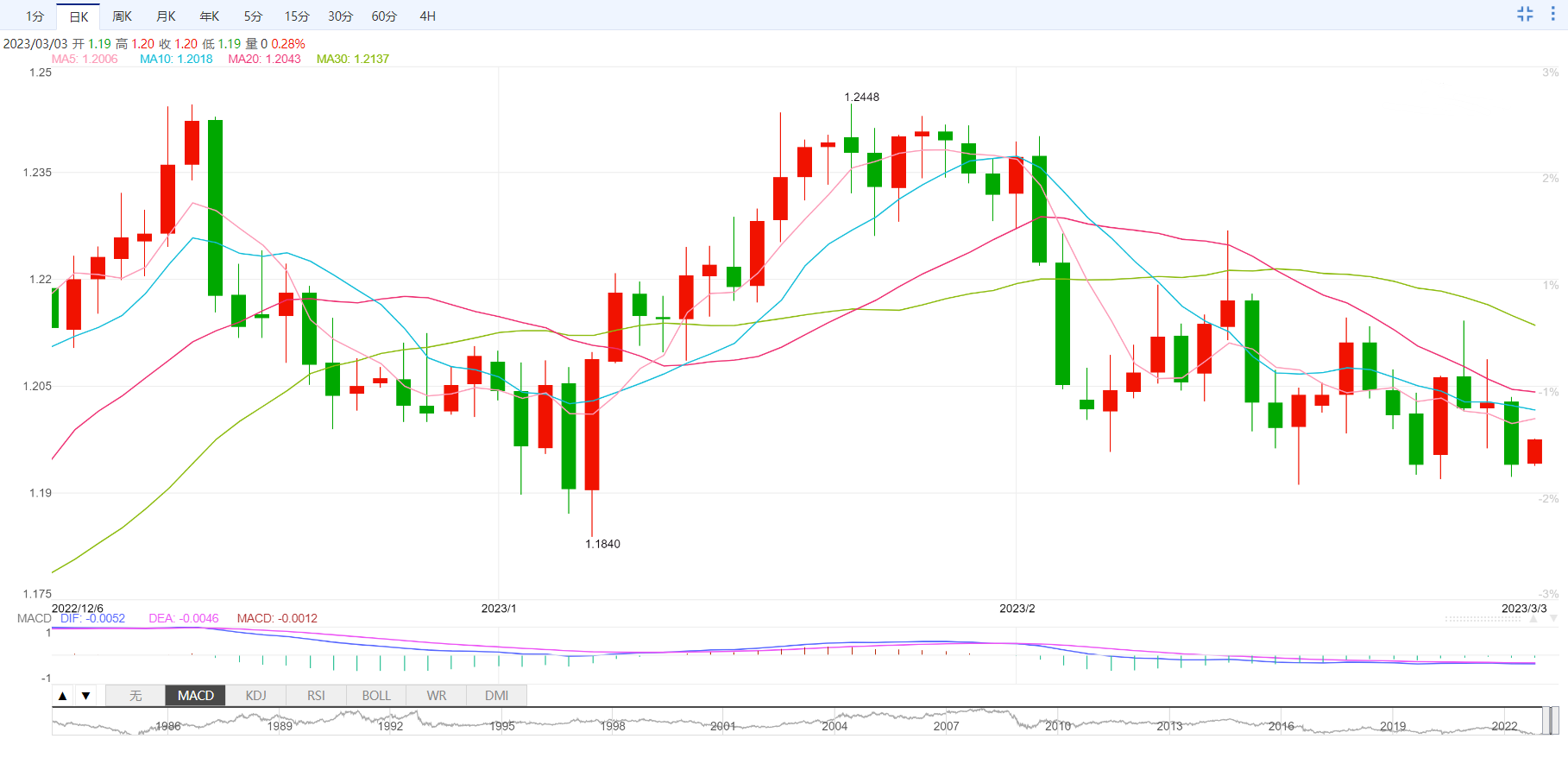 2月曾两次测试21日均线切入位1.2043,但都没有突破,该点位为关键阻力位;2月低点1.1915为初步支撑--2023年低点1.1842是重要支撑位