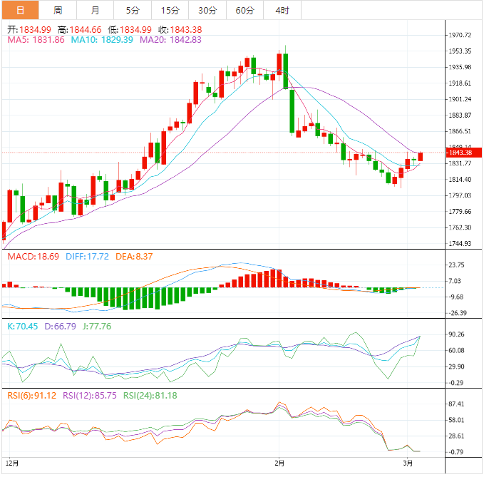 技术面:金价正形成一个倒转头肩形态,表明金价突破盘整区间将确认看涨反转。头肩底颈线位于自2月20日高点开始的水平线1840美元。 50EMA均线充当多头的重要支撑位。