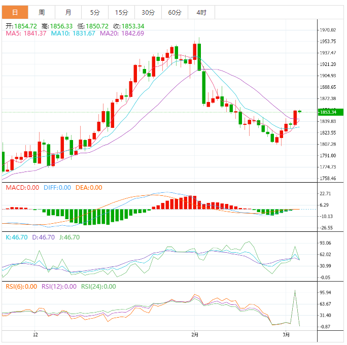 现货黄金:截止发稿,现货黄金小幅看低,现报1853.39,跌幅0.09%。欧市盘前,黄金交易员可能会看到市场进一步的不作为,因为在美联储主席鲍威尔的证词、中国通胀数据和周五美国2月份就业报告等关键事件之前,交易员仍保持谨慎。