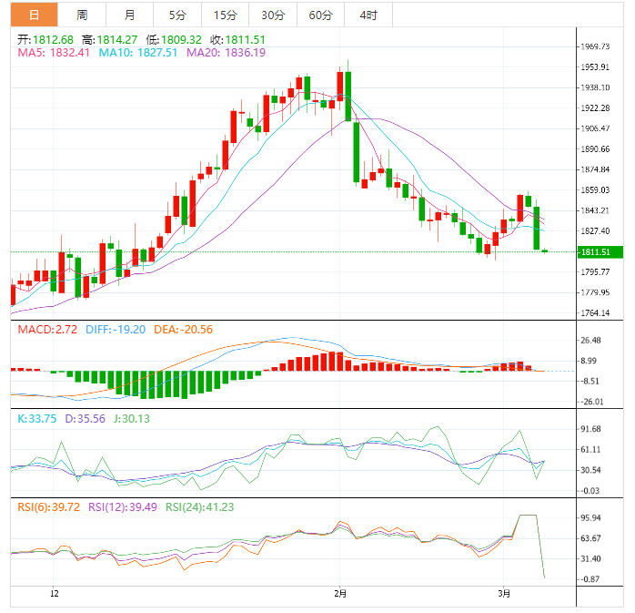 现货黄金:截止发稿,现货黄金小幅看低,现报1811.72,跌幅0.10%。欧市盘前,黄金价格连续第三天下跌,跌至一周以来的最低水平。值得注意的是,在美联储主席鲍威尔周二表现出进一步加息的准备,并支撑了美联储3月加息50个基点的押注后,黄金在前一天创下一个月来最大跌幅。接下来,美联储主席鲍威尔的第二轮证词和美国ADP就业变化(周五美国非农就业数据的早期信号)将对明确方向至关重要。