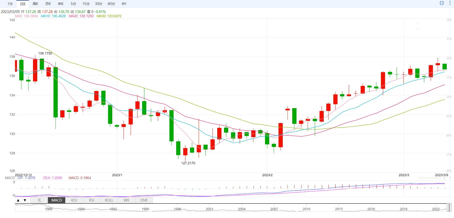 周四盘中,美元指数下跌至105.54,跌幅0.13%;欧元兑美元上涨至1.0552,涨幅0.10%;英镑兑美元上涨至1.1854,涨幅0.13%;美元兑日元下跌至136.70,跌幅0.41%;澳元兑美元上涨至0.6609,涨幅0.31%。