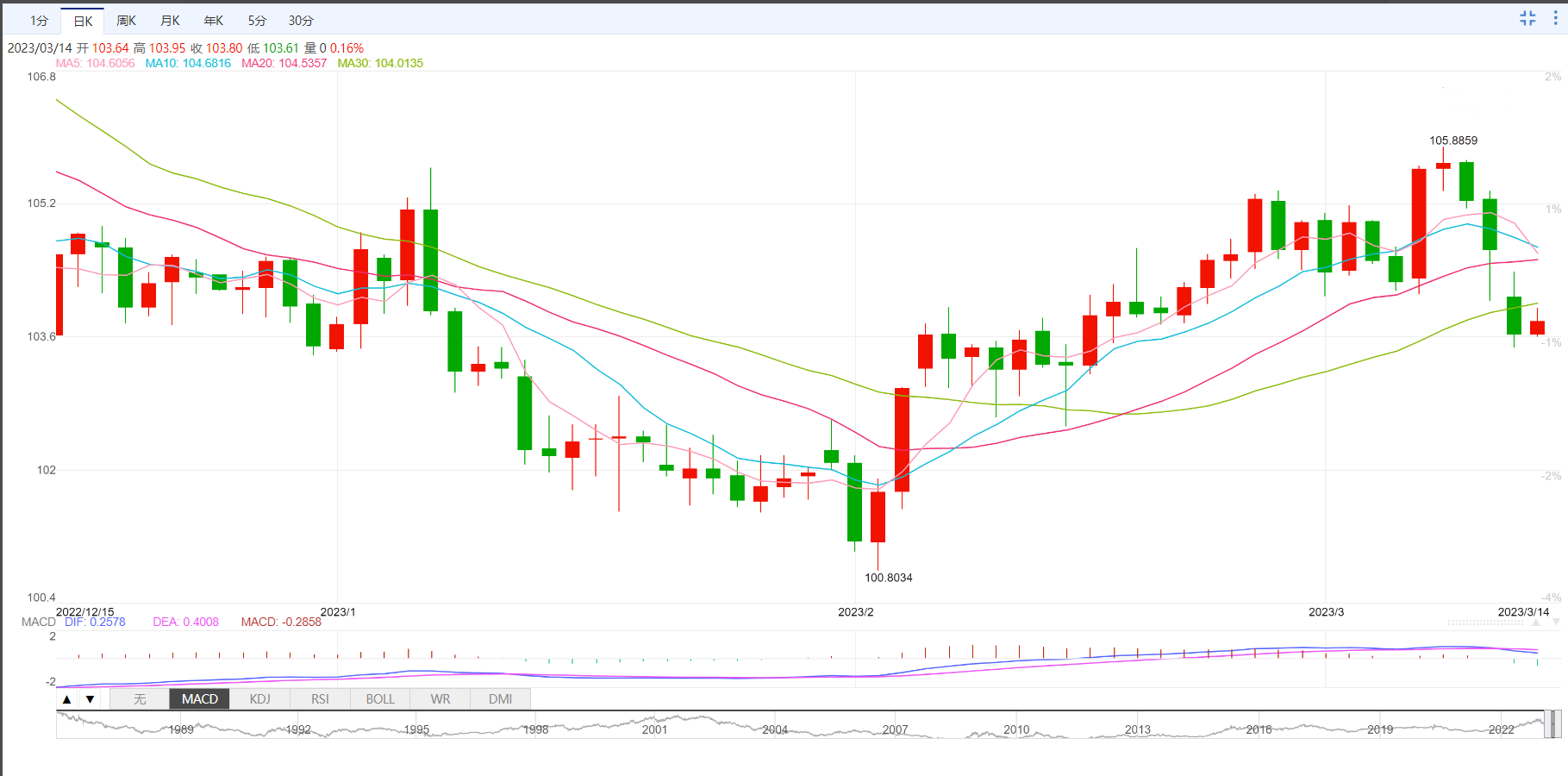 周二盘中,美元指数上涨至103.79,涨幅0.16%;欧元兑美元下跌至1.0710,跌幅0.16%;英镑兑美元下跌至1.2166,跌幅0.12%;美元兑日元上涨至133.48,涨幅0.19%;澳元兑美元下跌至0.6661,跌幅0.05%。
