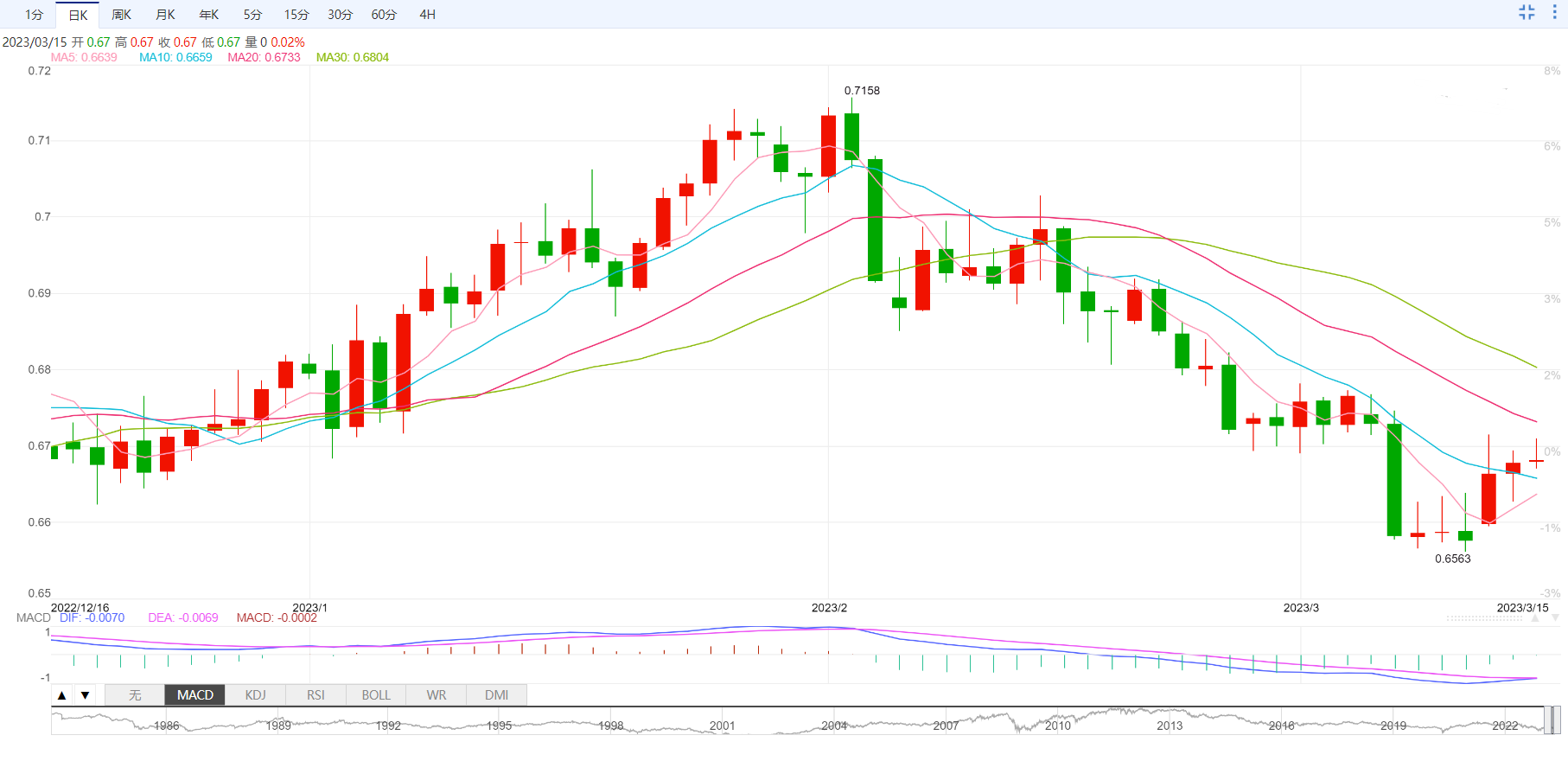 美元指数录得月度新低103.44后反弹。由于投资者等待美国零售销售和生产者物价指数,预计美元指数将出现波动。展望未来,今天公布的美国2月零售销售数据预期环比下降0.3%,前值为3.0%,这将是重要的观察数据,因为鹰派押注美联储(Fed)将在下周的联邦公开市场委员会(FOMC)会议上加息25个基点(bps)的情况最近有所改善。同样重要的是,在SVB丑闻和债券市场波动之后,新闻标题将传达市场情绪。