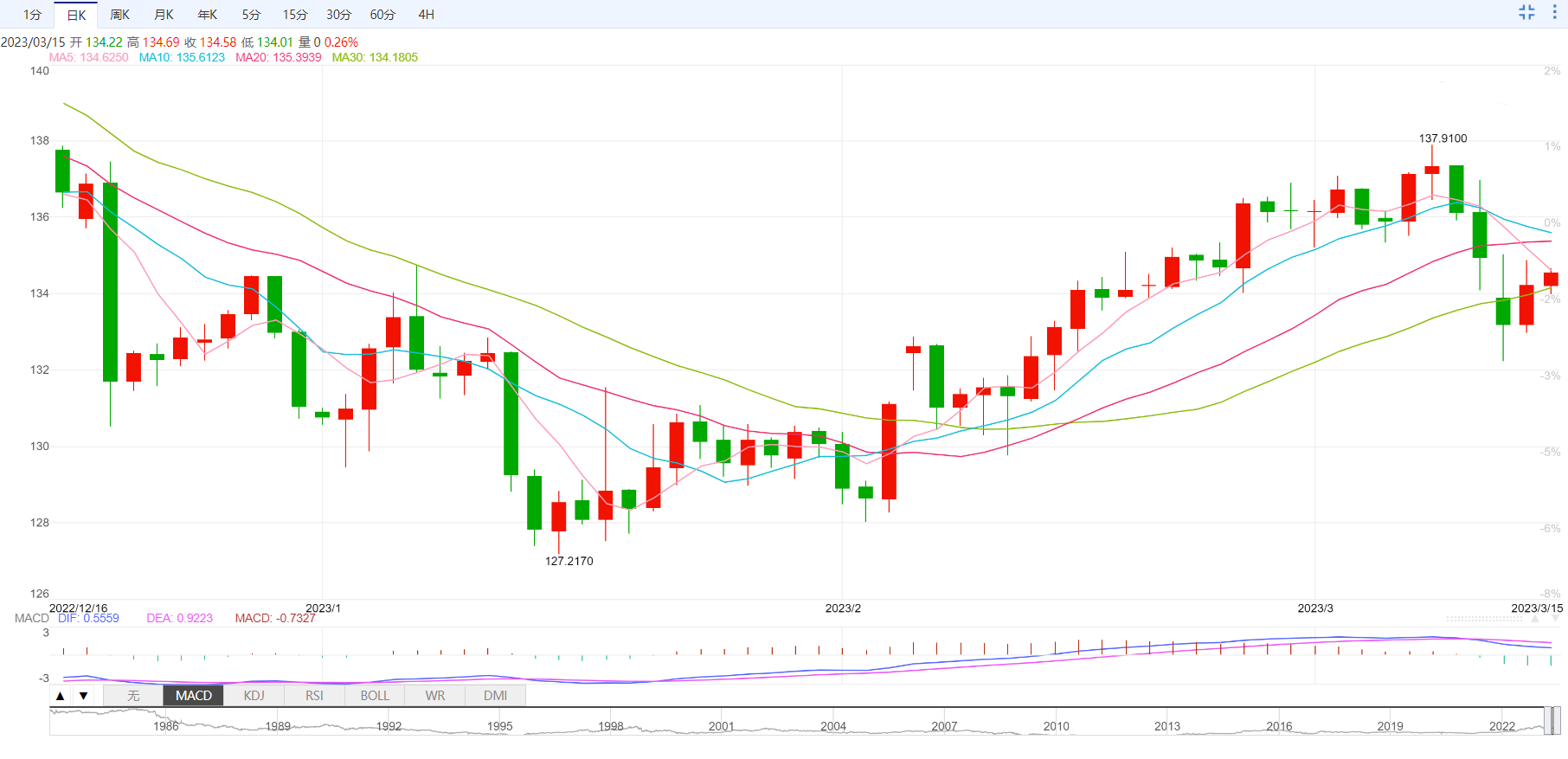 周三盘中,美元指数上涨至103.68,涨幅0.01%;欧元兑美元上涨至1.0738,涨幅0.07%;英镑兑美元上涨至1.2157,涨幅0.02%;美元兑日元上涨至134.58,涨幅0.26%;澳元兑美元上涨至0.6683,涨幅0.01%。