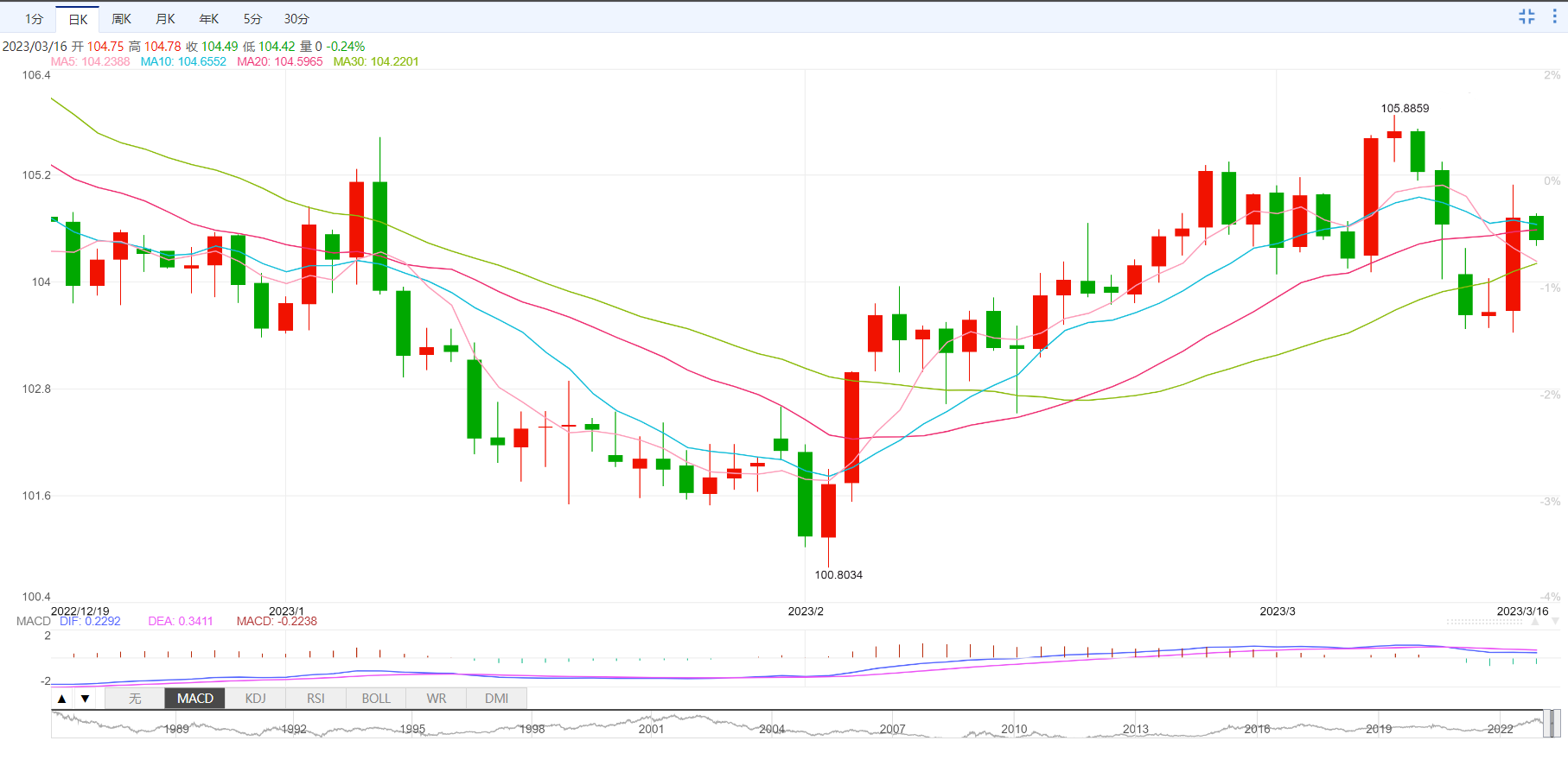 美元指数:截止发稿,美元指数下跌,现报104.46,跌幅0.28%。欧市盘前,美元指数巩固了一周最大的单日涨幅,刷新了盘中低点104.60附近。尽管如此,市场的不作为以及全球政策制定者急于安抚瑞信动荡引发的担忧,似乎有利于美元指数的最新回调。然而,美联储的鹰派押注以及没有任何重大进展可以对抗金融市场风险,使美元指数保持在多头上方。
