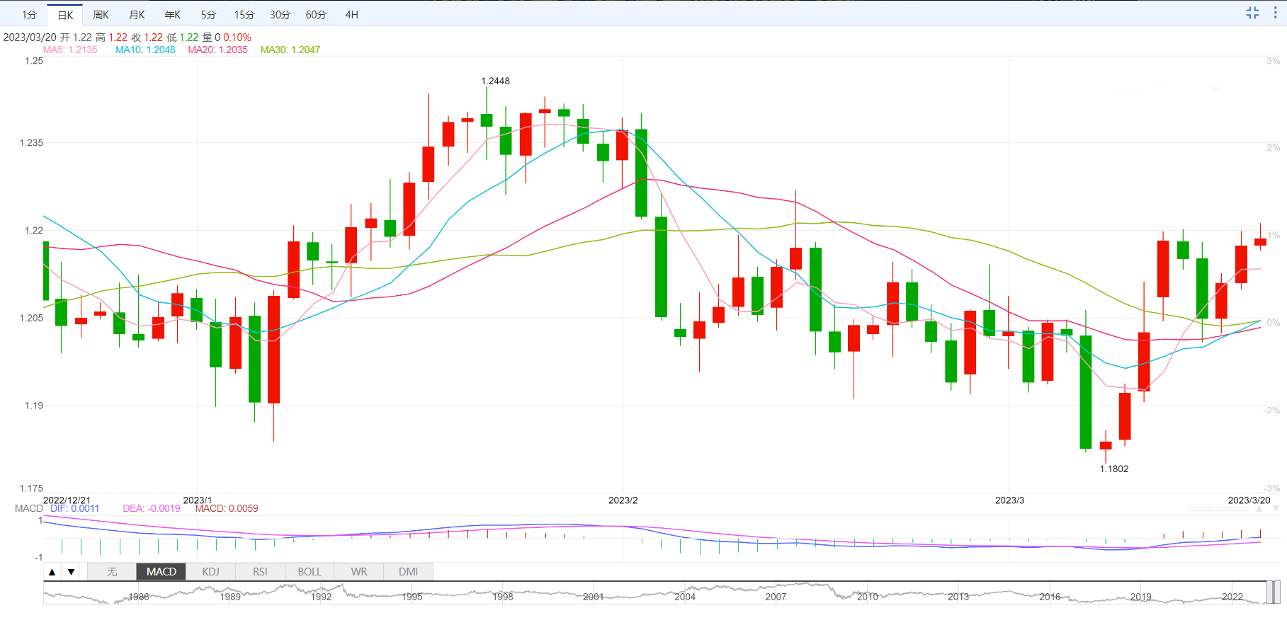 美元指数:截止发稿,美元指数下跌,现报103.80,跌幅0.07%。欧市盘前,美元指数正守住103.60支撑,然而,由于投资者的风险偏好正在改善,美元似乎倾向于下跌。标普500指数期货继上週五遭受重创后,亚市早盘强势反弹,因瑞银收购瑞士信贷的消息提振市场参与者信心。美联储将于周三公佈利率决议,因此,美元指数震盪于103.80附近。丹麦丹斯克银行(Danske Bank)分析师预计,美联储主席鲍威尔将加息25个基点,儘管最近银行业出现动盪。