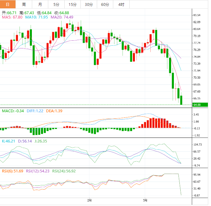 美原油:截止发稿,美原油大幅下跌,现报64.91,跌幅2.12%。欧市盘前,原油价格还是跌破了67美元大关。银行业危机可能蔓延。瑞士信贷银行分崩离析。后来,瑞银被敦促收购这家陷入困境的银行。WTI大幅下挫表明投资者强烈的悲观情绪,因为油价往往是增长的晴雨表。