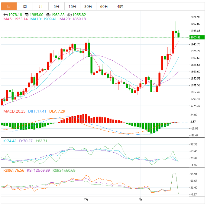 现货黄金:截止发稿,现货黄金小幅下跌,现报1965.85,跌幅0.65%。欧市盘中,金价创下历史上第三次突破2000美元大关的纪录;上一次金价突破2000美元是在新冠疫情时期。金价这轮强劲牛市始于今年3月低位1800美元附近,此后金价一直没有反弹。金价价格与美国国债收益率呈很强的负相关关係,3月美国国债收益率明显回落。