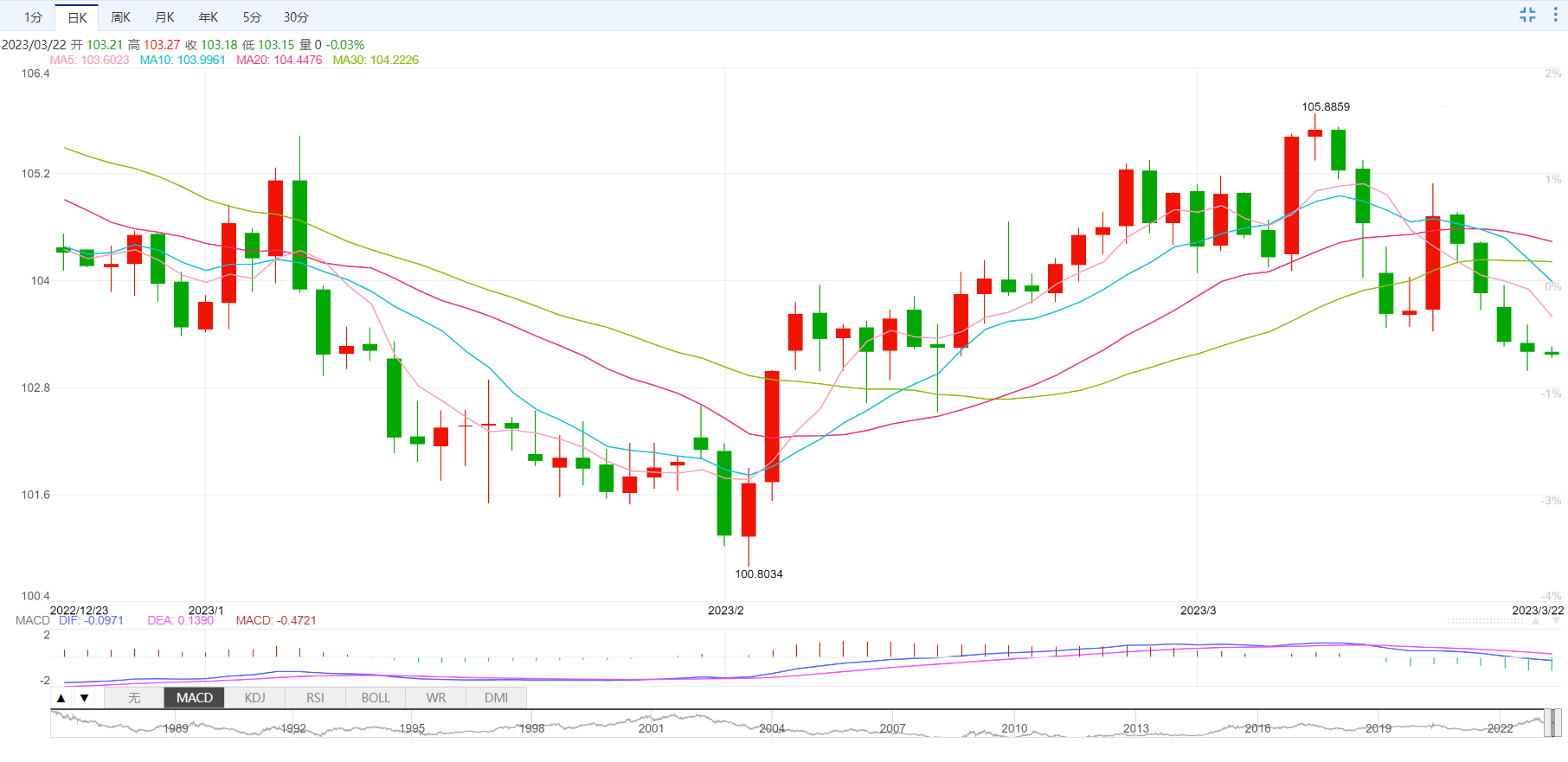 美元指数:截止发稿,美元指数下跌,现报103.20,跌幅0.04%。欧市盘前,美元指数努力维持下跌势头。即便如此,美元兑六大主要货币依然承压于前日录得的五週低点附近,接近103.20。