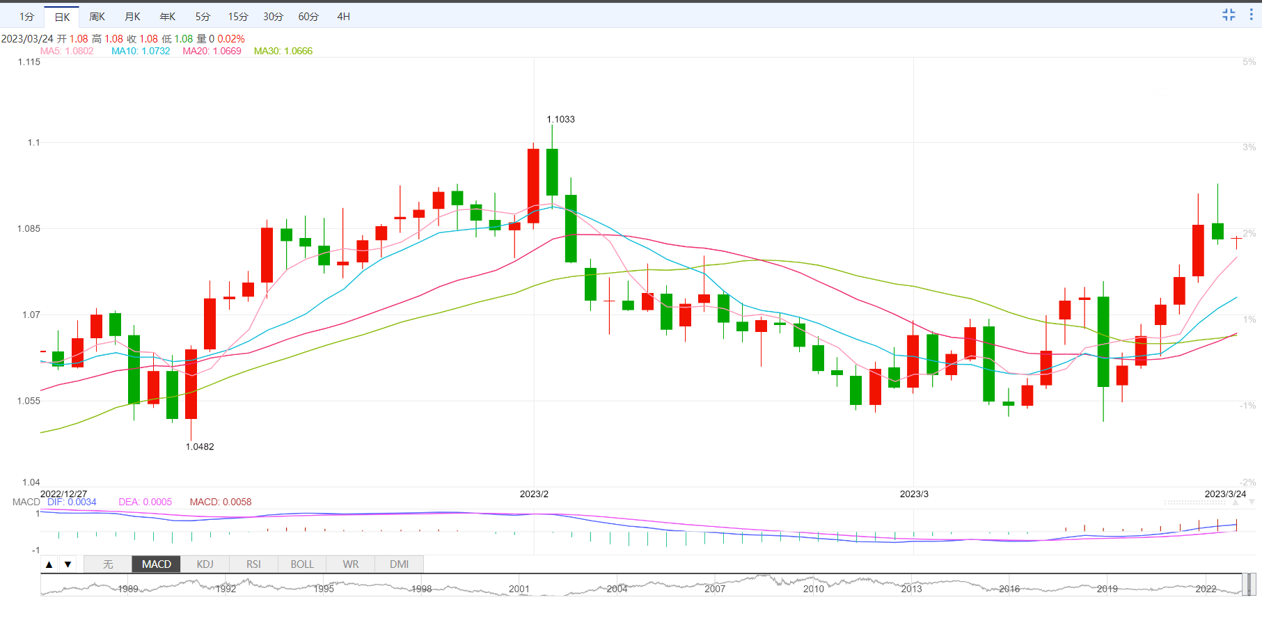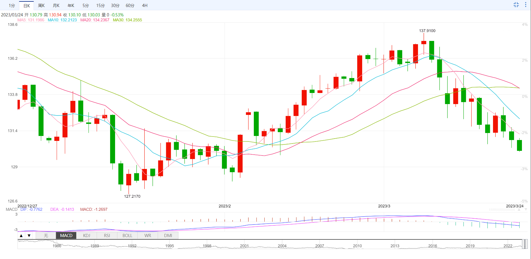 周五盘中,美元指数下跌至102.51,跌幅0.07%;欧元兑美元上涨至1.0835,涨幅0.01%;英镑兑美元下跌至1.2285,跌幅0.01%;美元兑日元下跌至130.14,跌幅0.49%;澳元兑美元下跌至0.6684,跌幅0.01%。