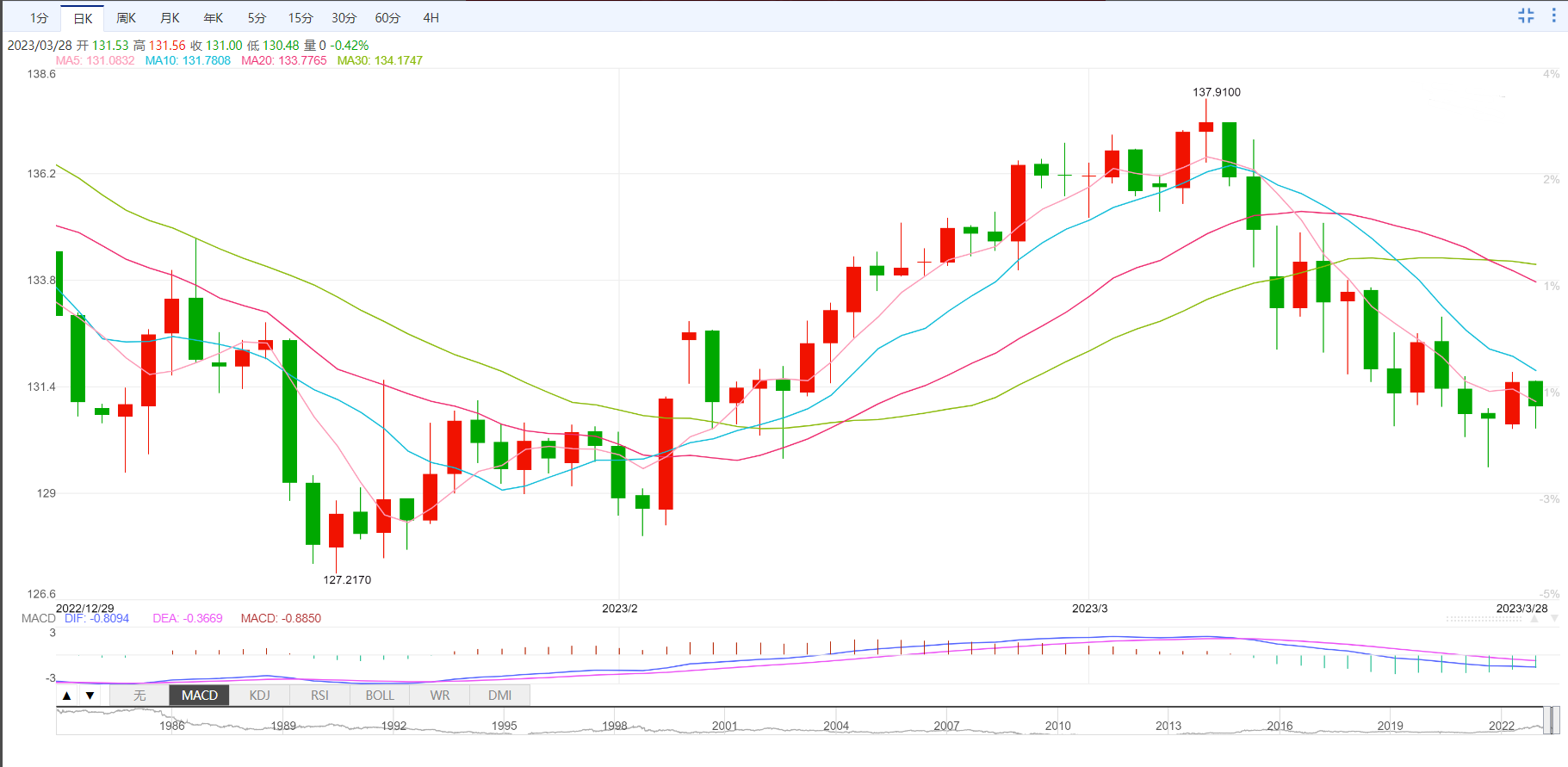 美元兑日元一度跌0.74%,至130.56日元,最新下跌0.68%,基本回吐了前一交易日上涨的全部涨幅。上日美国长期公债收益率飙升15个基点,为六个月最大升幅。