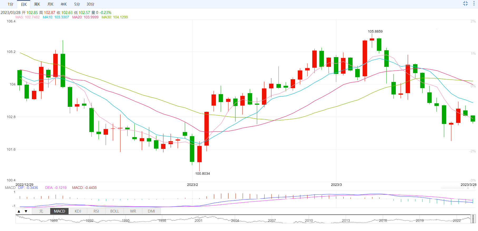 技术面:目前美元指数下跌0.20%报102.62,若突破10.193(3月23日低点)将打开跌向100.82(2023年2月2日低点)和100(心理水平)的大门。另一方面,下一个阻力位于103.37(55日SMA),其次为104.23(100日SMA)和105.88(2023年3月8日高点)。