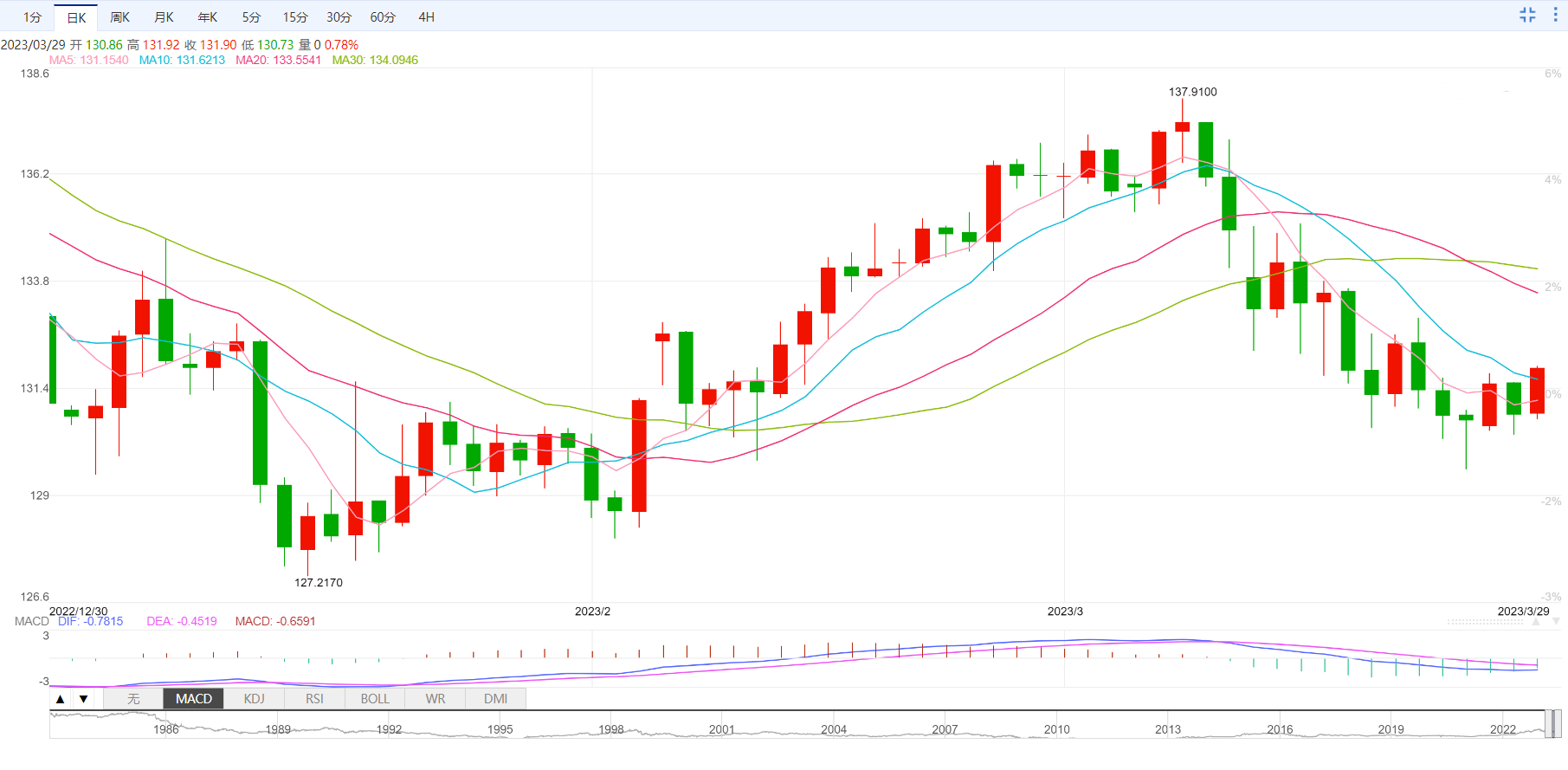 美元兑日元带动日元交叉盘走高,日元则走弱;美元兑日元从130.76涨至131.80