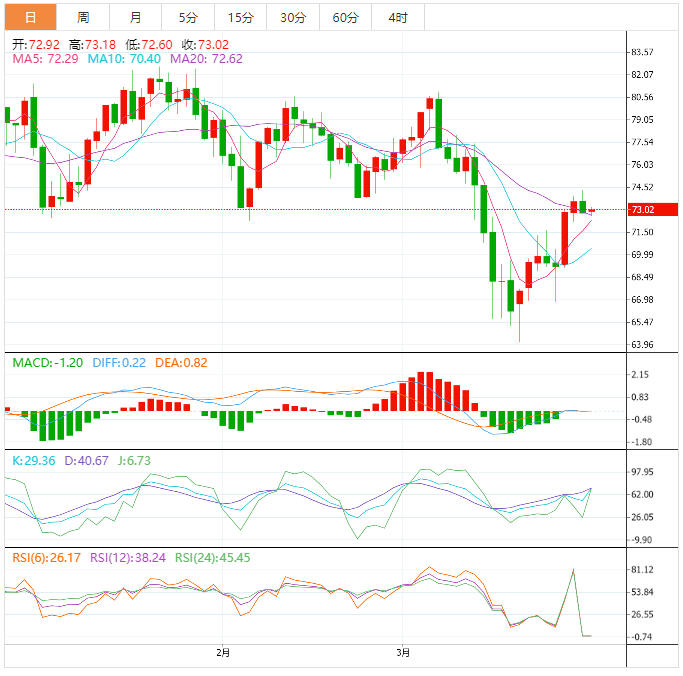 美原油:截止发稿,美原油小幅上涨,现报73.01,涨幅0.28%。欧市盘前,截至3月24日的当周,原油库存减少750万桶,至4.737亿桶,此前预估为增加9.2万桶。虽然当时出现了石油短缺,但由于美元有所回升,WTI未能获利。美元指数(DXY),追踪美元对一篮子六种货币的价值,上涨了0.31%,达到102.745。这使得石油价格对国际买家来说更加昂贵。
