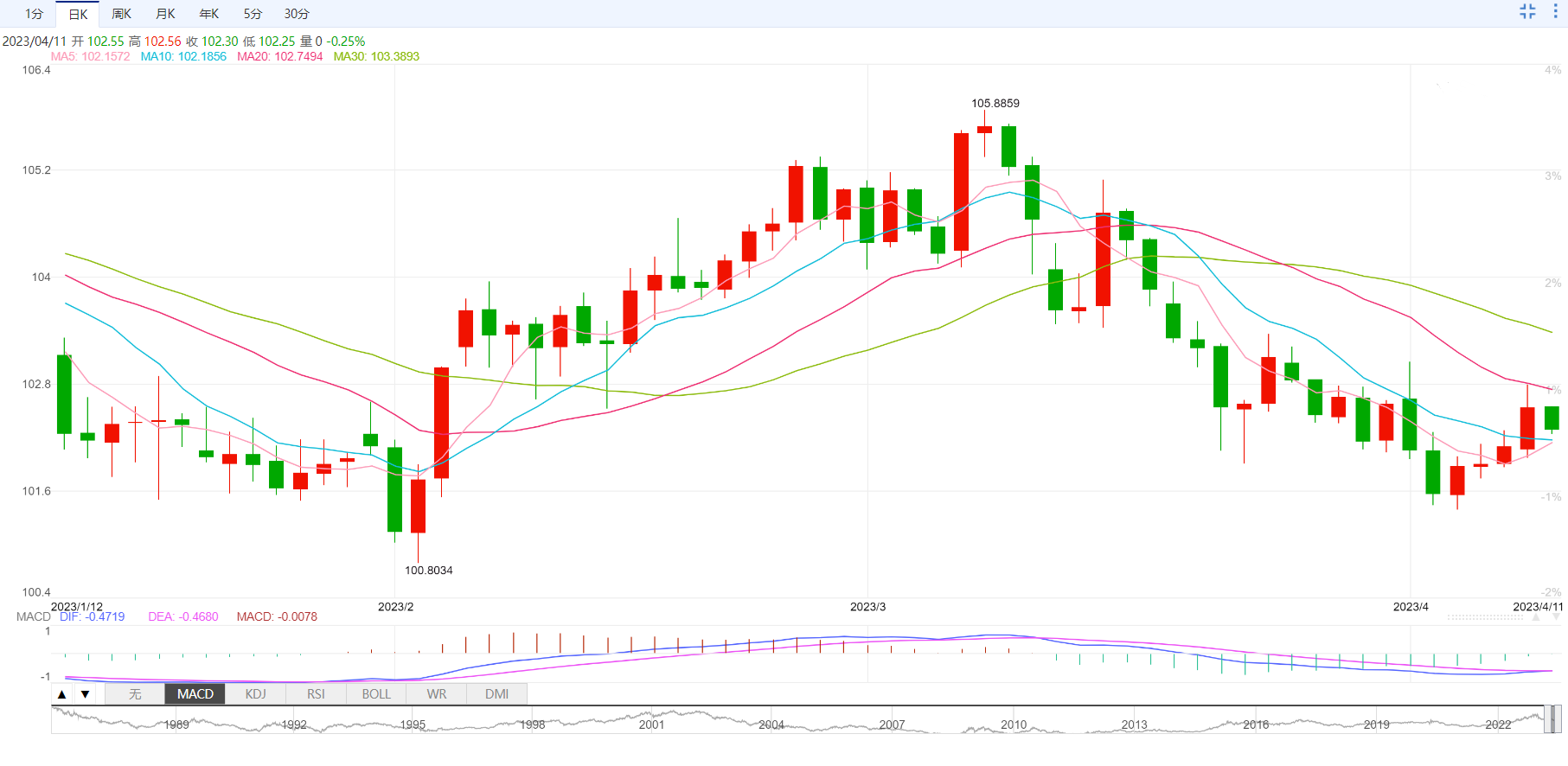 若收盘高于21日移动均线102.78,将是个正面信号。
