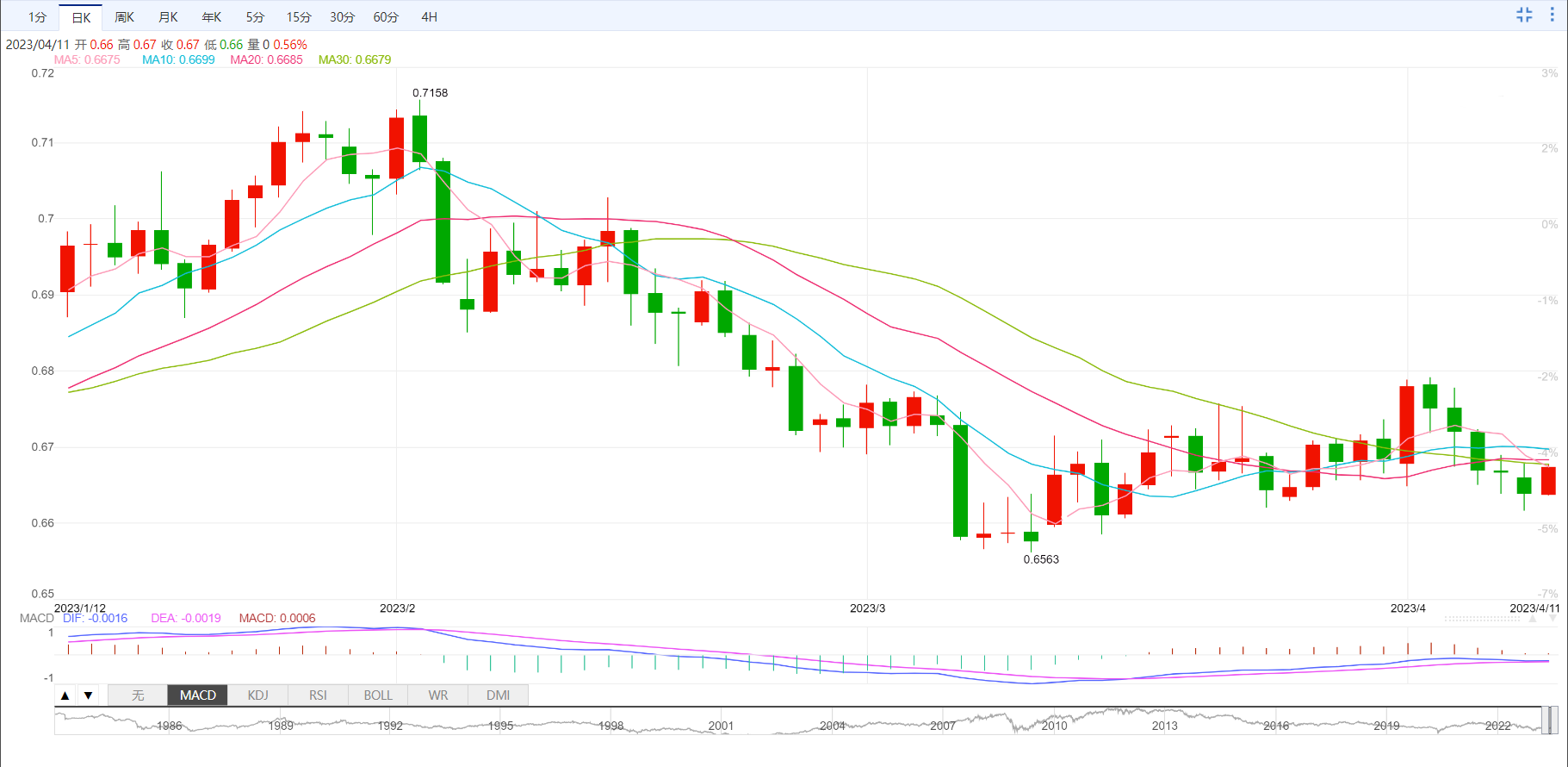 阻力位在21日均线0.6687和10日均线0.6700处,如果收盘高于0.6700,压力将转向上行。