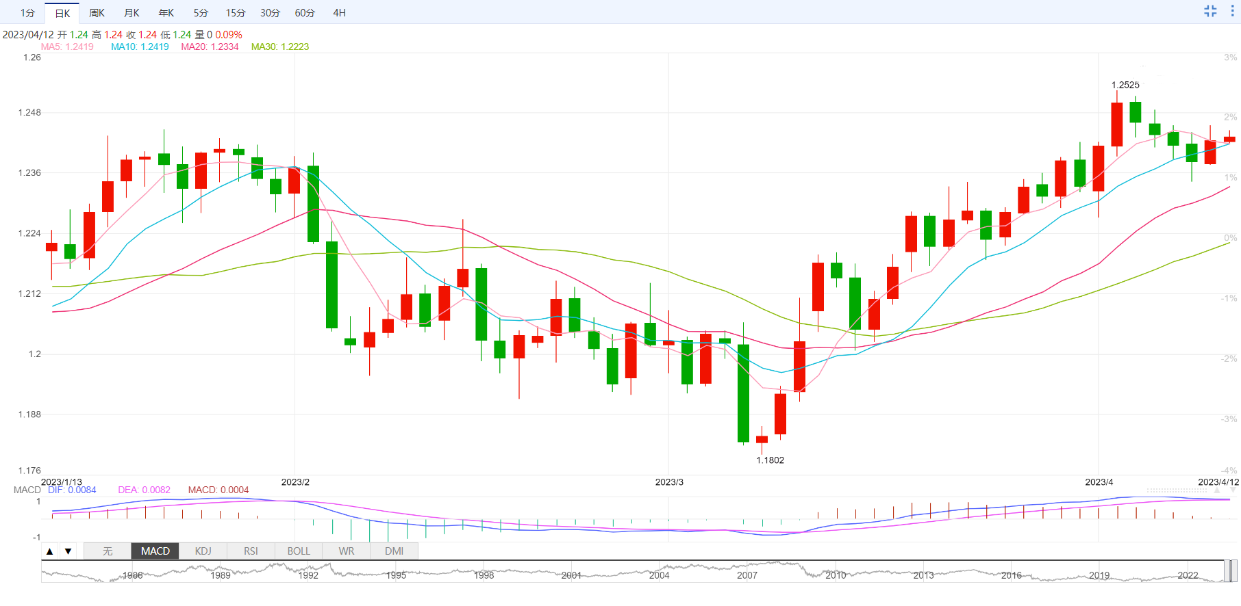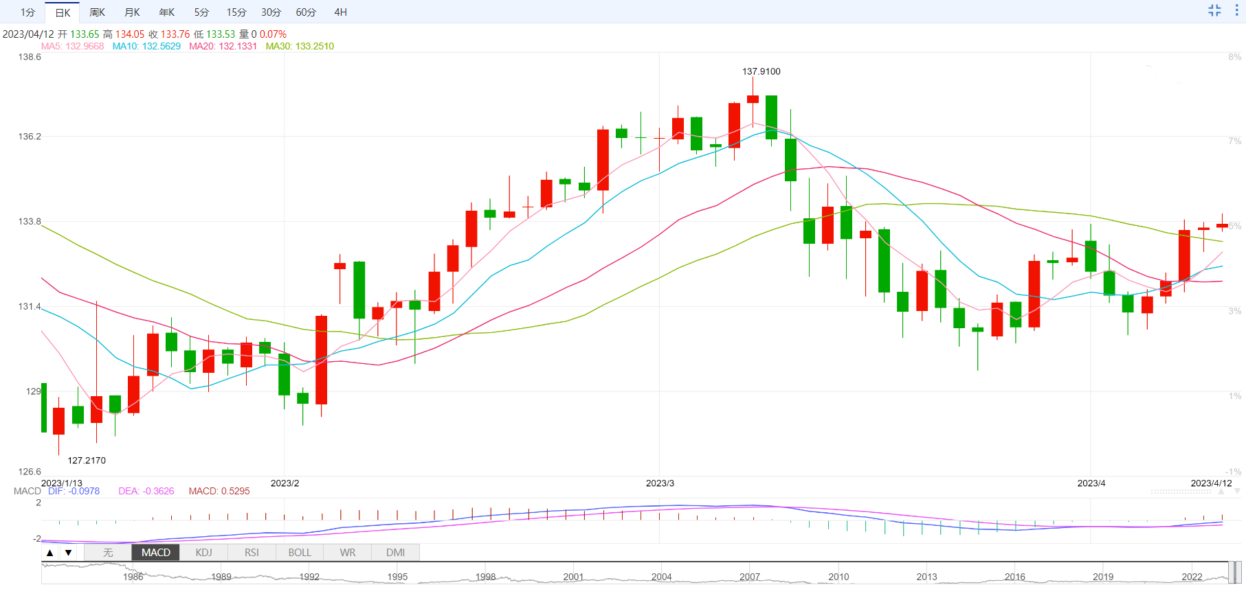 周三盘中,美元指数下跌至102.03,跌幅0.12%;欧元兑美元上涨至1.0930,涨幅0.14%;英镑兑美元上涨至1.2434,涨幅0.09%;美元兑日元上涨至133.76,涨幅0.06%;澳元兑美元上涨至0.6665,涨幅0.16%。