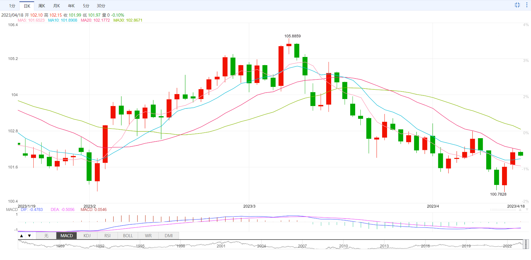 10日和21日移动均线下行--仍维持净偏空格局,收于21日移动均线102.22之上将结束下行趋势。