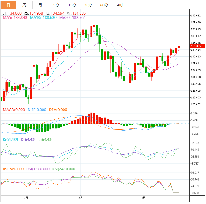 日元:美元兑日元当天上涨0.5%,在133.95的低点和135.13的高点之间波动。美元周三走强,受美国国债收益率上升提振,两年期美国国债收益率(对美联储货币政策预期很敏感)升至一个月高点4.286%。这使得美元兑日元在看涨趋势的前端反弹至135.11。
