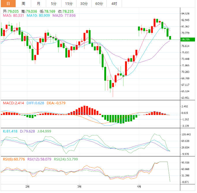 美原油:截止发稿,美原油小幅下跌,现报78.22,跌幅0.90%。欧市盘中,WTI原油再次刷新两週低点至78.30美元左右,连续第四天下跌。在此过程中,该能源基准油探至100天指数移动平均线(EMA),同时也接近了3月20日以来的上行支撑线。