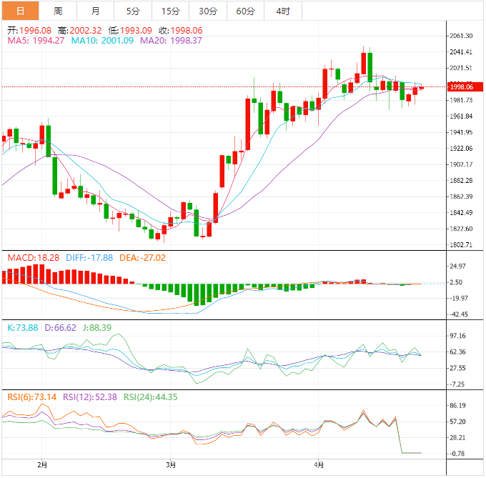现货黄金:截止发稿,现货黄金小幅看涨,现报1998.28,涨幅0.10%。欧市盘前,金价依然承压于1995美元附近,多头等待新线索以捍卫两日升势。由于市场情绪谨慎乐观,加上关键的美国第一季度GDP数据和3月耐用品订单数据公佈前市场焦虑,黄金兑美元陷入挣扎。