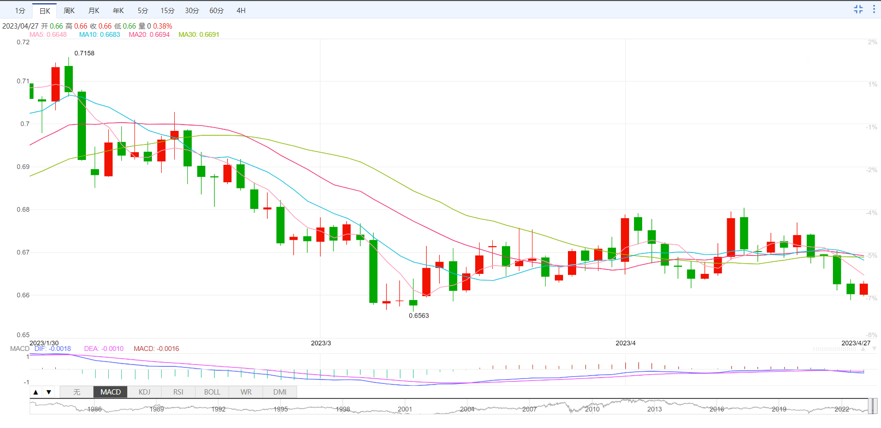 欧元兑美元周四盘旋在一年高点附近,因为欧洲经济富有韧性,反观美国,则银行业风险蔓延,债务上限形成僵局,经济可能陷入衰退。对风险敏感的澳元竭力守住关键的0.66美元关口。