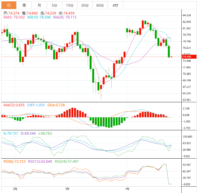 美原油:截止发稿,美原油小幅上涨,现报74.45,涨幅0.13%。欧市盘中,WTI在74.00美元附近的月度低点舔舐伤口,在周四欧洲交易时段,由于市场对美国第一季度国内生产总值(GDP)做了准备,该原油在74.45美元附近出现了温和买入价。在此过程中,黑金结束了连续两天的下跌趋势,同时巩固了1.5个月来的最大单日跌幅。