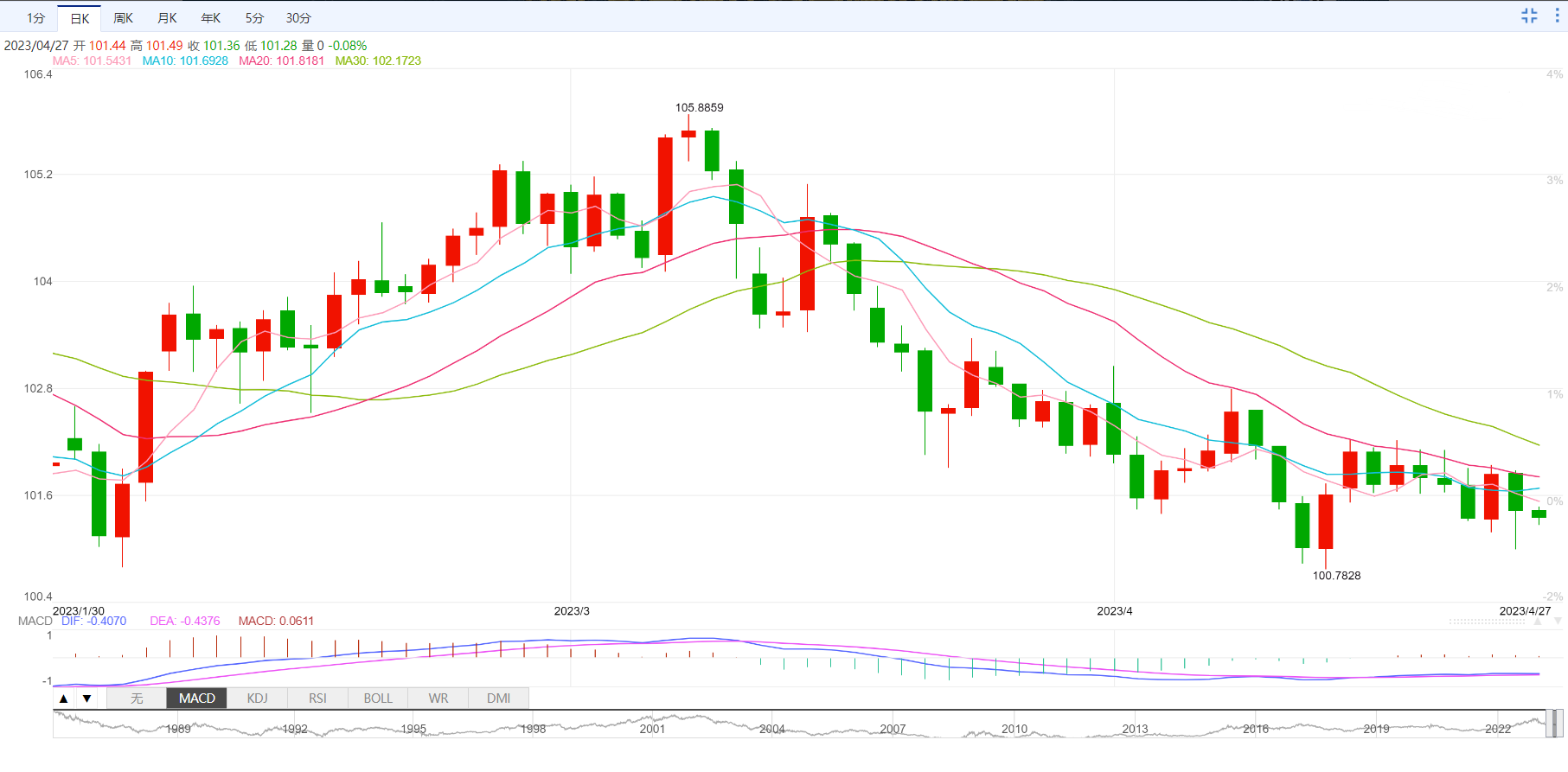 支撑位:101.39 100.92 100.64