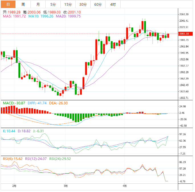 现货黄金:截止发稿,现货黄金小幅看涨,现报2001.22,涨幅0.64%。欧市盘中,黄金价格强势延伸其复苏,突破了2,000美元的心理阻力位。在连续加息25个基点之后,投资者预期美联储在5月的货币政策会议上对利率指引持中性立场,因此金价在2000美元上方获得接受。