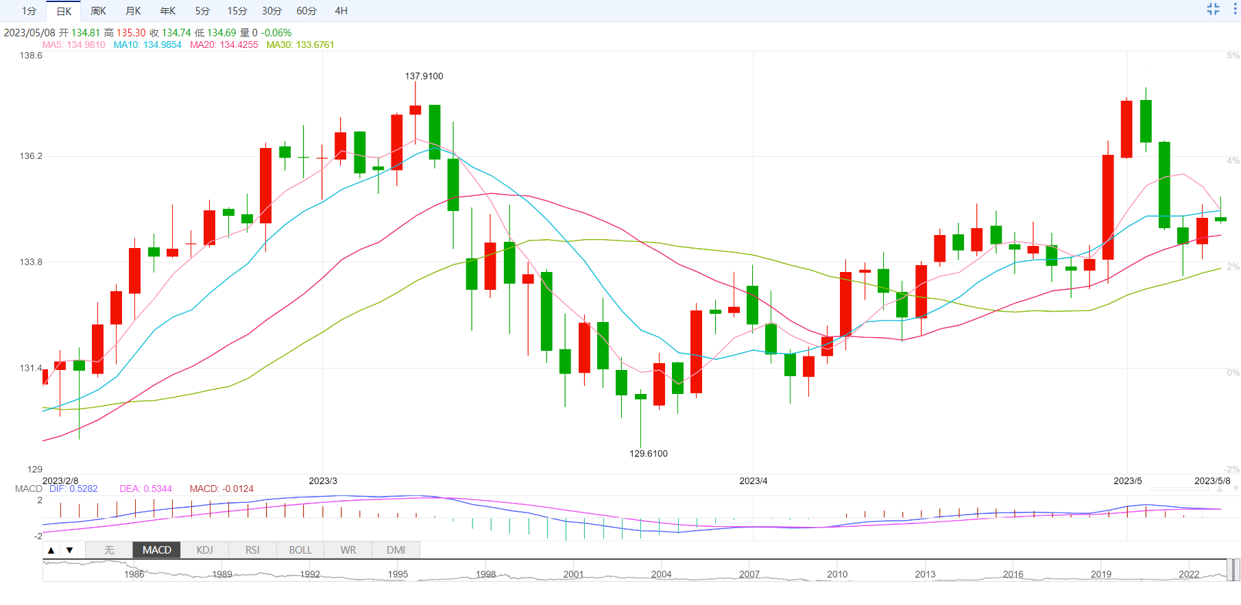 周一盘中,美元指数下跌至101.13,跌幅0.14%;欧元兑美元上涨至1.1041,涨幅0.21%;英镑兑美元上涨至1.2648,涨幅0.14%;美元兑日元下跌至134.74,跌幅0.07%;澳元兑美元上涨至0.6774,涨幅0.38%。